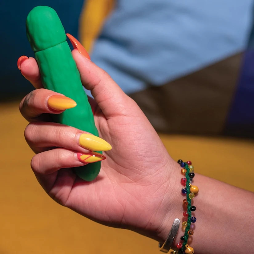 Pickle Emojibator will quickly become your new favorite dill-do.. This adorable toy has 10 vibration patterns in a water-resistant and textured design that is safe for shower play. This frisky little pickle is sure to tickle you in all the right ways.