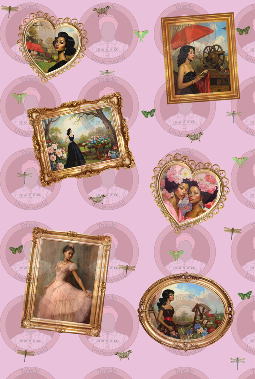 'Queen Shaliah’s Gilded Garden' is fabric print of an opulent celebration of beauty, calmness, and timeless femininity. This print evokes the grandeur of my sister (Shaliah), and her essences of creativity and whimsy, paired with her love for a good vintage romance story with a modern, playful twist. The twist in this romance story is loving yourself, completely. When you take the time to pour loving energy into your own soul- the beauty you radiate becomes an art form that inspires the world around you to become that Gilden Garden you've been seeing in your dreams.